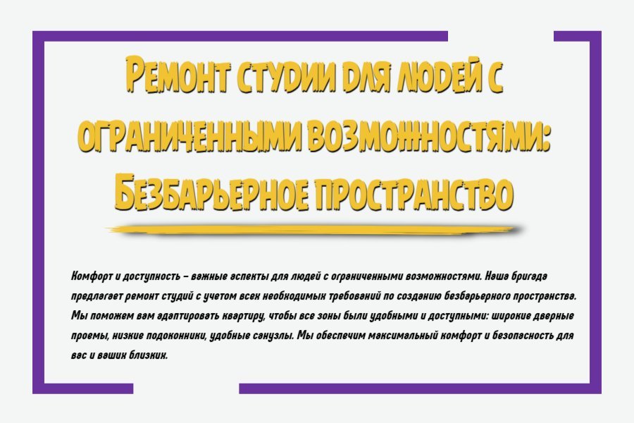 Создание безбарьерного пространства в студии – это важная задача, которая требует тщательного планирования и внимания к деталям. Такой ремонт должен учитывать все особенности передвижения и взаимодействия с окружающей средой, чтобы обеспечить максимальный комфорт, безопасность и независимость для людей с ограниченными возможностями. Важно, чтобы студия была удобной, функциональной и адаптированной под индивидуальные потребности. Рассмотрим ключевые аспекты, которые нужно учитывать при ремонте студии для людей с ограниченными возможностями.